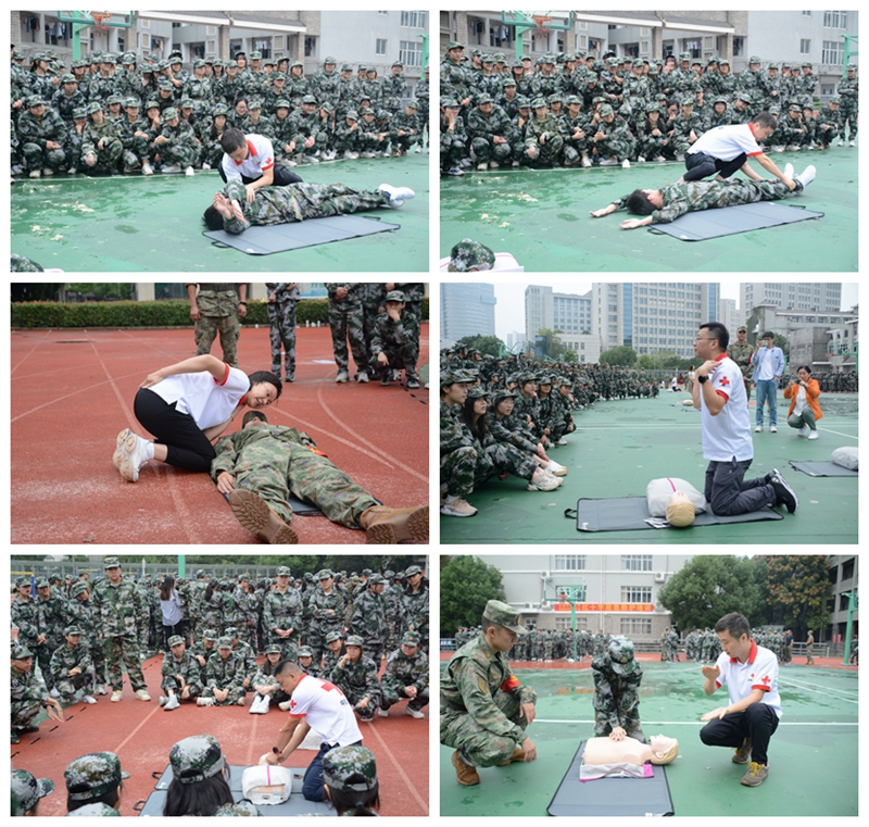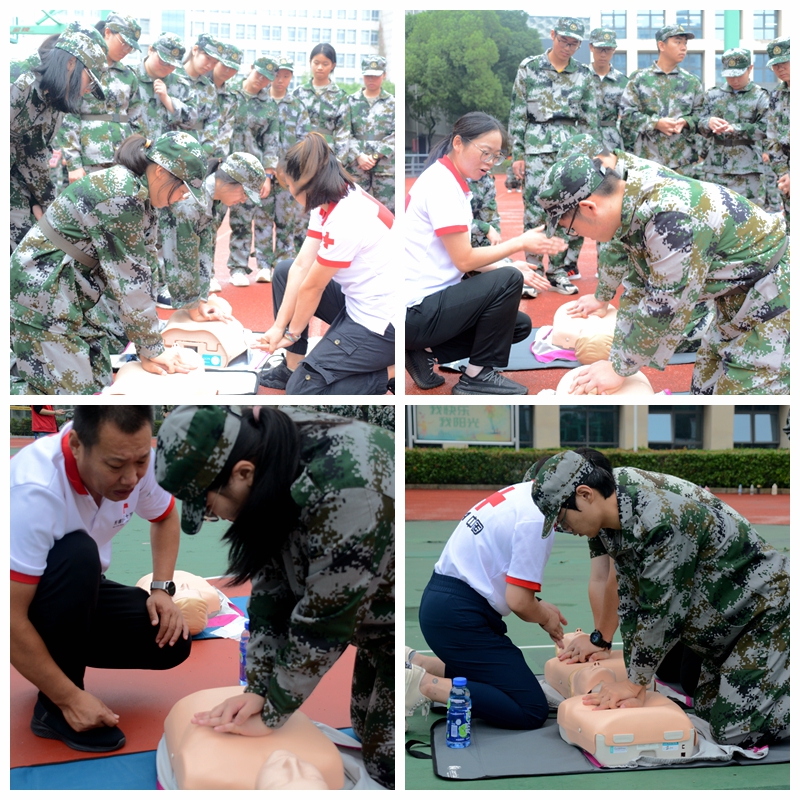 在无锡市红十字会应急救护培训师的带领下,学员们分组进行现场模拟演练。培训师们手把手指导参训学生进行实操练习,对操作中存在的问题给予纠正和示范,使学员们良好的掌握了心肺复苏等急救技能和AED的正确使用方法。培训过程中,参训学生认真聆听,踊跃参与实操练习,扎实掌握操作要点。期间,教官们和青年学生也积极担当志愿者,更生动形象的让同学们学习到心脏复苏等急救技能。