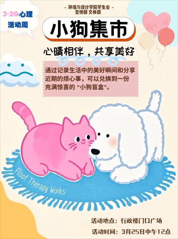 3月25日,行政楼文化广场热闹非凡,环境与设计学院精心打造的“小狗集市”开市啦。这是一场别开生面的心理互动活动,以“书写小美好,兑换治愈力”为主题,通过趣味互动和情感分享,为同学们打造了一个轻松愉悦的心灵驿站。