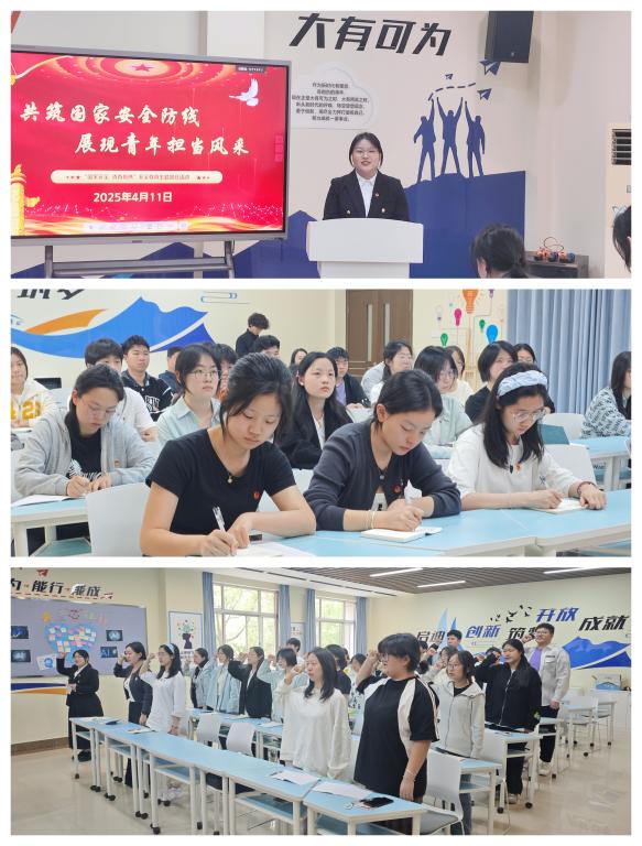 4月11日中午,校学生会功能性团支部在学生成长与发展中心举行“共筑国安防线,彰显青春担当”安全教育全校示范主题团日活动。活动邀请梁溪公安分局内保大队戴淮利警官以《新时代青年如何守护国家安全》为题,从《国家安全基本法》核心条款解读、实际案例分析、校园安全讲解等三个维度展开专业讲解。在观看宣传片后,优秀团员代表张佳梦上台领誓,全体同学在戴淮利、章慧(驻校警官)见证下,面对团旗作出"捍卫国家安全,维护校园稳定"的庄严承诺。