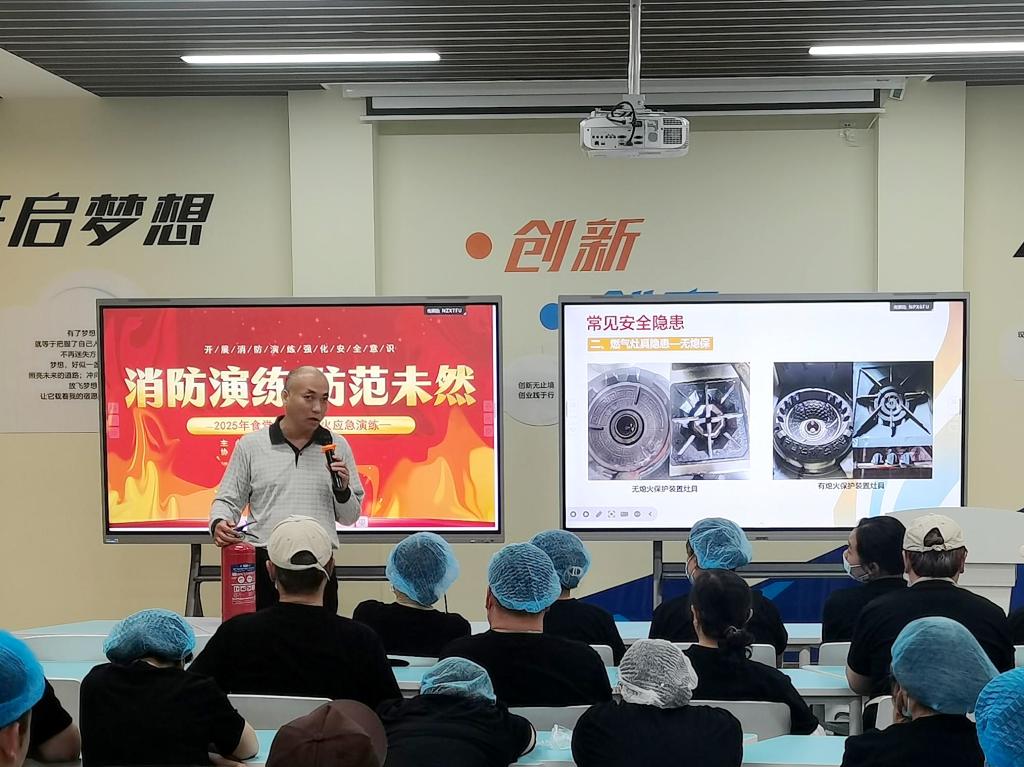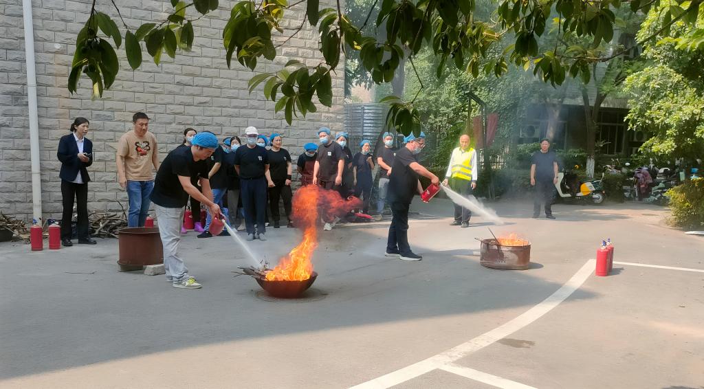 最后,食堂工作人员进行了灭火器实操训练,进一步巩固消防器材的使用技能。