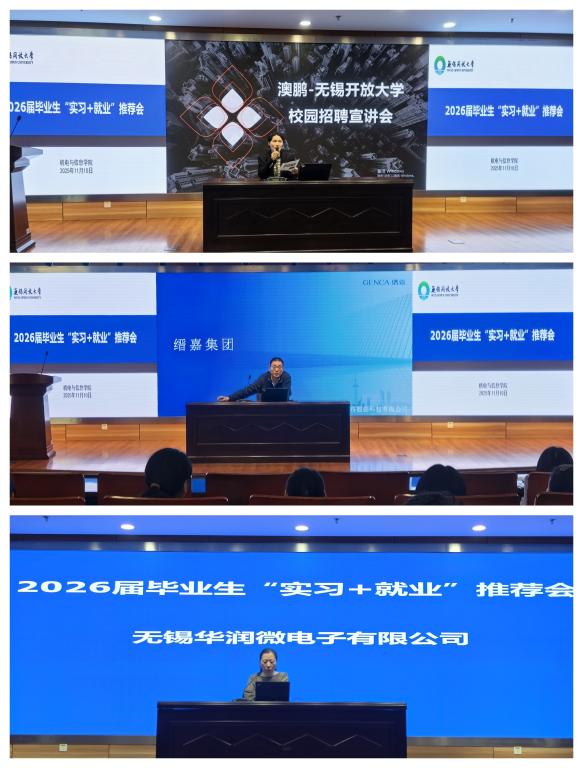 为进一步深化校企合作,落实学生技能培养目标,推动毕业生顶岗实习顺利开展并实现高质量就业,11月10日和11月17日,机电与信息学院分别为计算机网络技术和机电一体化技术2026届毕业生举办专场“实习 + 就业”推荐会。此次推荐会邀请了澳鹏科技(无锡)有限公司、无锡华润微电子有限公司、上海本冉数据科技有限公司来校宣讲,机电与信息学院院长胡云、相关班主任、教师以及2026届全体毕业生参加活动。