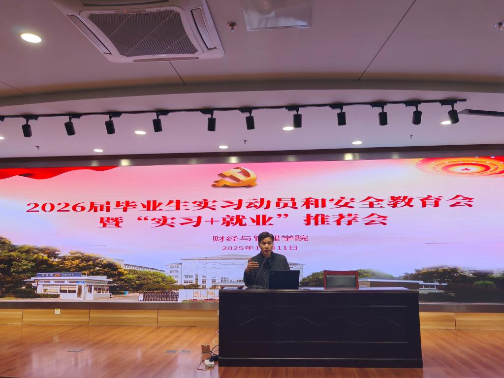为扎实推进学生实习与就业工作,引导学生树立正确的实习观与就业观,近日,财经与管理学院召开2026届毕业生实习动员和安全教育会暨“实习+就业”推荐会,学院21级全体学生参加会议。