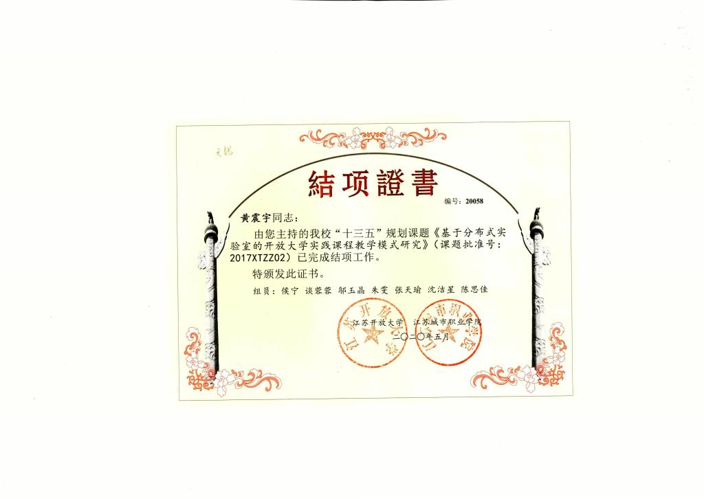 由工作室黄震宇老师主持的江苏开放大学“十三五”科研规划课题“基于分布式实验室的开放大学实践课程教学模式研究”经过二年的研究,取得了一定的成绩,于近期通过结项。