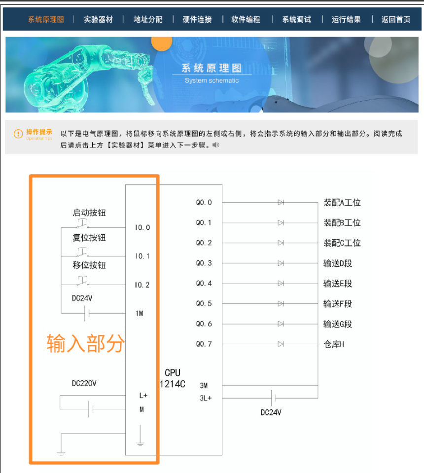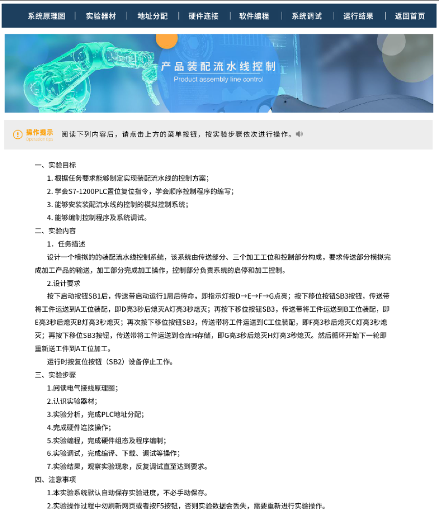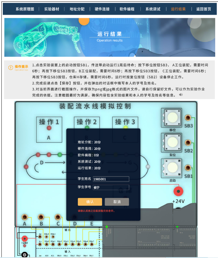 (2)虚拟实训技术实现。依托PLC虚实融合实训平台,利用虚拟实验的沉浸性和交互性,设计线上虚拟实训方案和脚本。使学习者能够在虚拟的学习环境中完成PLC系统的设计和调试,大致包括“阅读系统原理图、认识实验器、进行实验分析、硬件联线操作、编写实验程序、调试实验程序和观察实验结果”七个步骤。学习的过程中,学生通过网络课程的学习,主动地接收信息、整理信息、应用信息,帮助学习者掌握知识并进行技能训练,充分体现主动性、独立性、监控性、交互性、技术性和开放性的远程学习特点。