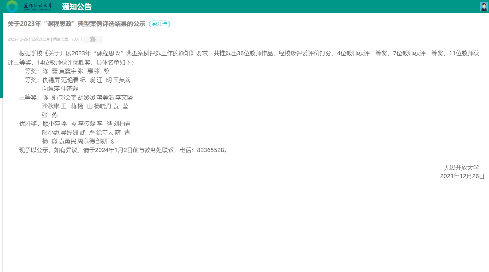 2023年12月张惠老师、王芙蓉老师、杨晓丹老师分别获无锡开放大学课程思政典型案例评选一、二、三等奖