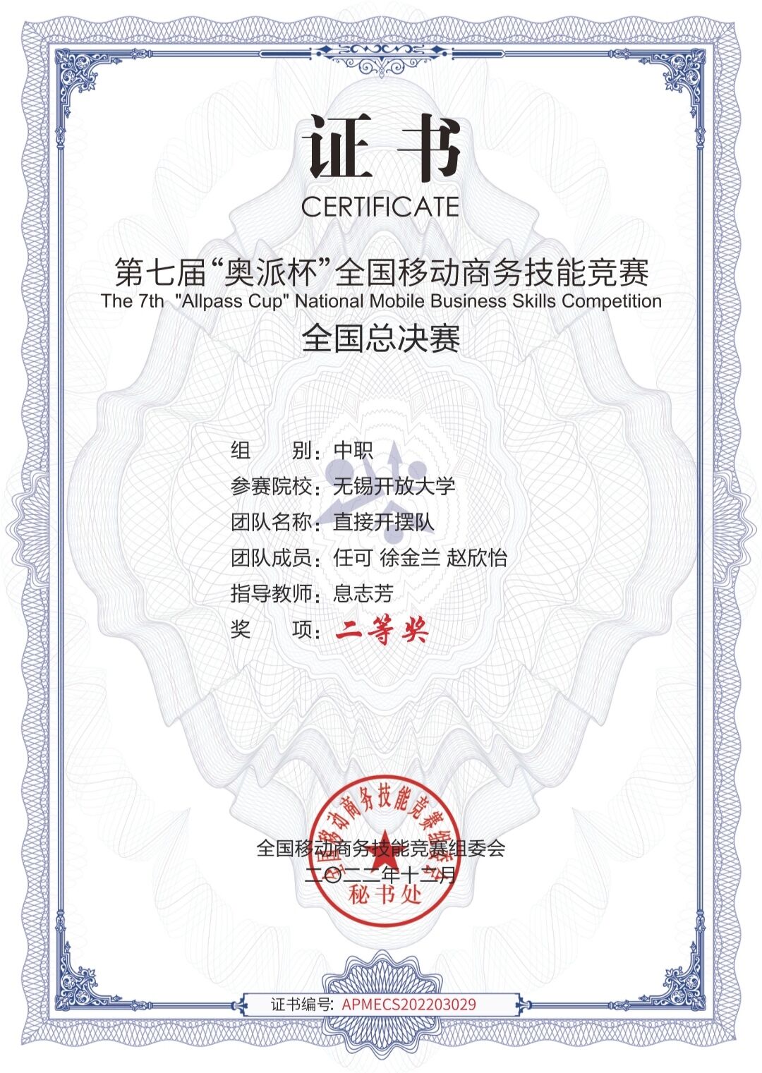 经过省赛的激烈竞争,我校 徐金兰、任可、赵欣怡三位同学脱颖而出,获得了参加“奥派杯”全国商务移动竞赛的机会,在全国竞赛中,荣获二等奖。