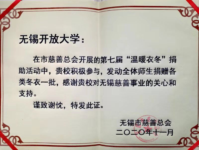 11月份,在2020年“温暖衣冬”慈善捐赠活动中,我校师生尤其是广大教职员工和乐龄学院老年学员们,积极响应无锡市慈善总会号召,在仅一周的捐赠时间内,就迅速有序、自愿自发捐助御寒冬衣达30余箱500余件。无锡市慈善总会对我校的潜心组织工作和广大师生的热情参与给予高度评价,唐余开副会长率队莅临学校调研,党委奚小网书记代表学校领受了《捐赠证书》。目前,这批冬衣已由无锡市慈善总会的义工们整理消毒,并请爱心车队专程送往了新疆霍城地区。