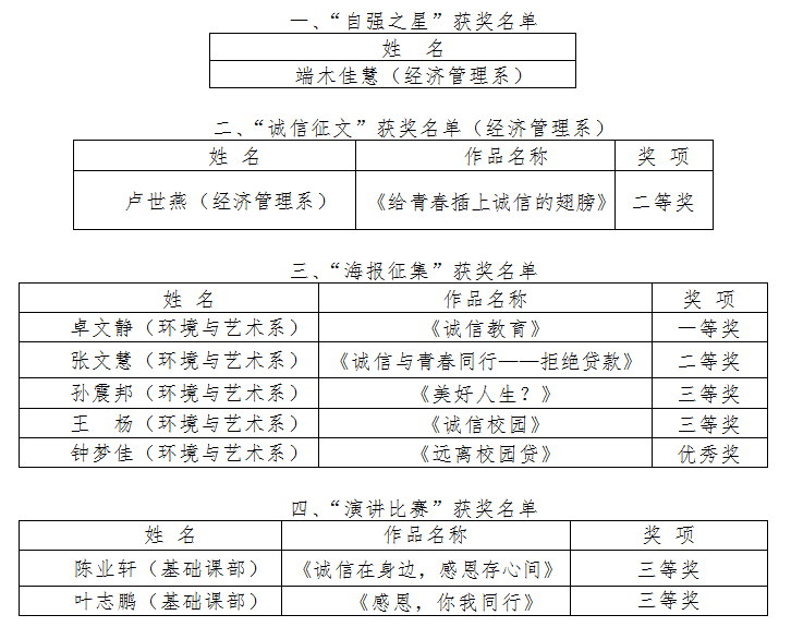 另讯:2020年学生工作处和各系部高度重视经济资助和思想育人相融合,引导受资助学生提升个人思想政治素养,学好专业知识,努力做到德智体美劳全面发展。近日从省校传来喜讯,我校学生在省校办学系统“诚信与青春同行,责任与担当并重”为主题的资助诚信教育活动中获得一等奖1项、二等奖2项、三等奖和优秀奖5项,1名学生被评为“自强之星”。名单如下: