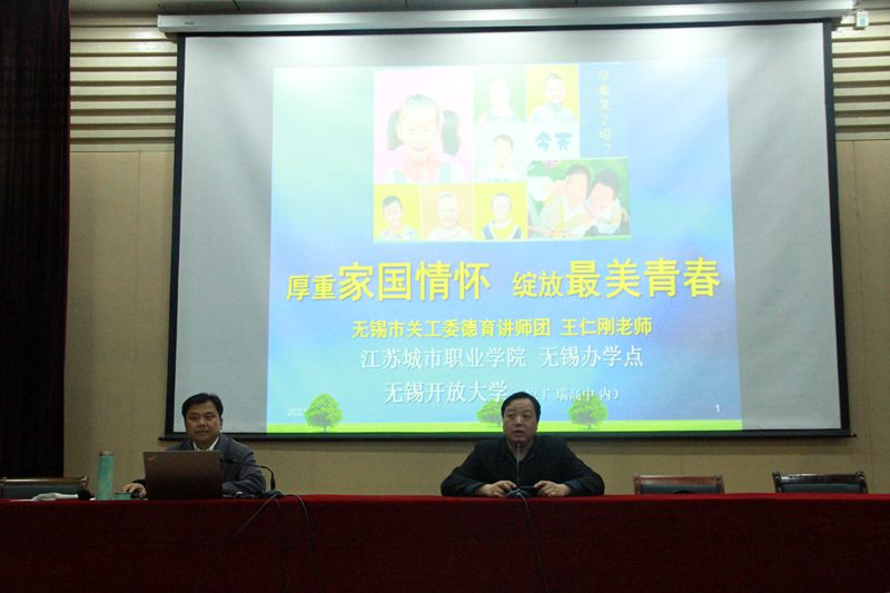 2021年4月27日下午,由无锡市塔影中学和无锡开放大学联合举办的 “做最好的自己——励志辅导会”在我校报告厅隆重举行。无锡市塔影中学吴旭校长、德育处包涵主任和340余名初三学生、8位班主任老师、初三年级组长参加辅导学习。辅导会由吴旭校长亲自主持,邀请无锡市关工委德育报告团成员、江苏省未成年人教育先进工作者、无锡市德育工作带头人、我校党委副书记王仁刚老师作《厚重家国情怀,绽放最美青春》专题辅导。