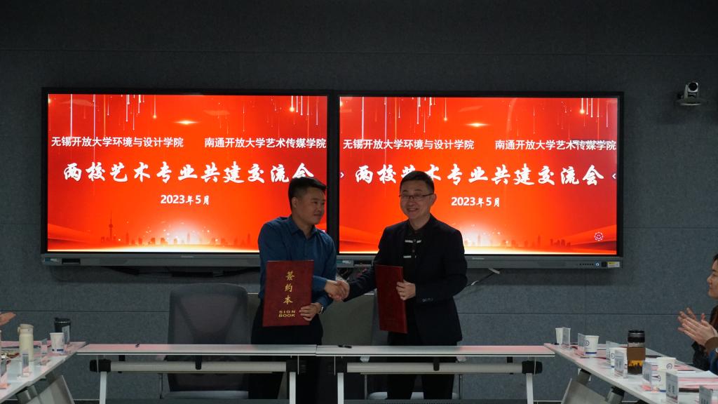 会议开始,薛亮副校长向无锡开放大学环境与设计学院魏院长一行的到来表示欢迎,介绍了学校整体情况和办学特色,并对未来两校艺术专业的合作共建提出了殷切的希望。魏旭峥院长就无锡开放大学环境与设计学院的情况作了简要介绍,并提出希望能够在专业教学模式探索、人才培养和师资队伍建设上进一步深化合作。胡涓华副院长以“探索•践行•改革•创新”为主题向大家详细介绍了南通开放大学艺术传媒学院工作室的教学模式,以及近年来在助力专业发展和人才培养等方面取得的成绩。乔鸿君院长从“走出去”、“请进来”和“强内涵”三个方面介绍了艺术传媒学院在师资队伍建设和专业发展方面进行了怎样的探索和实践。会谈中,双方围绕如何推进专业建设的高质量共建进行了深入探讨,并签署艺术专业共建协议。