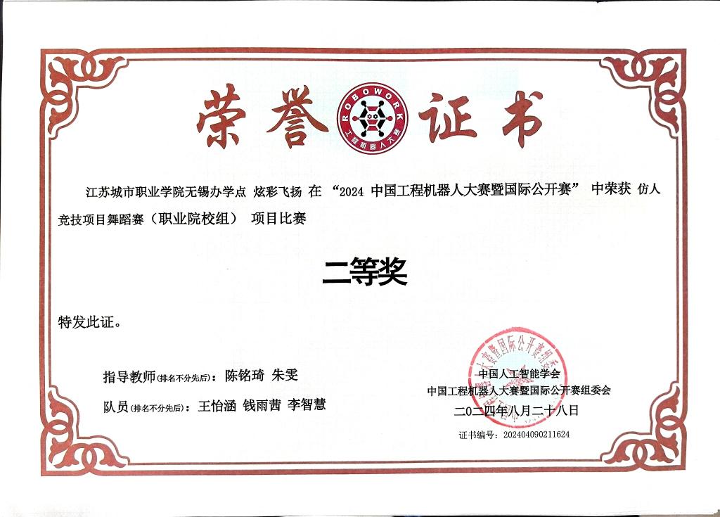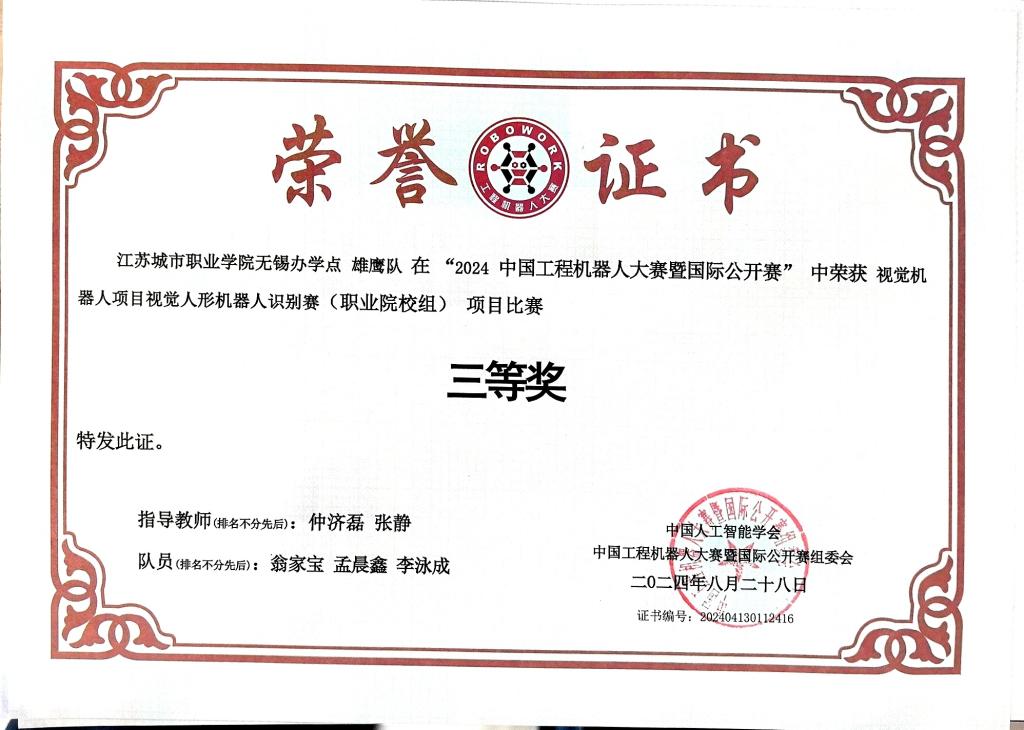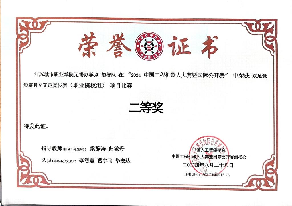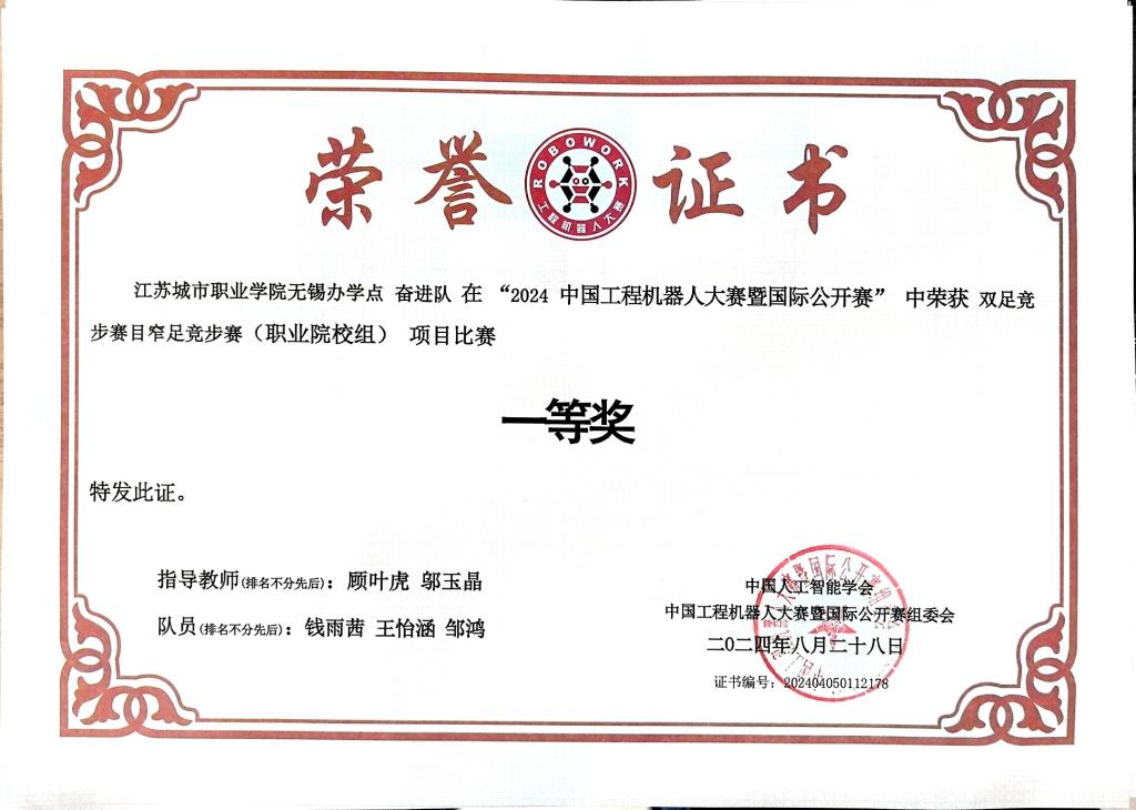 8月15日至17日,2024中国工程机器人大赛暨国际公开赛在西安高新国际会议中心举行。我校机电与信息学院组织自动化社团成员王怡涵、钱雨茜、孟晨鑫、邹鸿、李智慧、葛宇飞参加了窄足竞步、交叉足竞步、仿人竞技舞蹈、视觉人形机器人识别四个项目的比赛。在学校的正确领导和大力支持下,在顾叶虎、邬玉晶、陈铭琦、朱雯、仲济磊等老师精心指导下,团队成员克服时间紧、参赛项目多、竞赛要求变化等困难,主动放弃暑假积极投入训练,赛场上努力拼搏,斩获一等奖1项、二等奖2项、三等奖1项,实现四个参赛项目全部获奖。