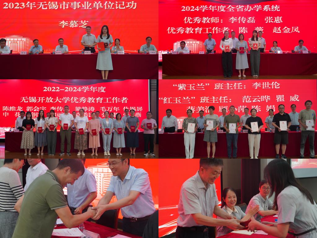 党委副书记高峻、副校长杨磊云、副校长邵小明、副校长丁晓华分别宣读了2023年无锡市事业单位人员记功决定、2024年度全省办学系统优秀教师、优秀教育工作者名单、《关于2022—2024学年度无锡开放大学优秀教育工作者推荐评选情况的通报》、《关于授予李世伦等班主任老师“紫玉兰”、“红玉兰”班主任的通报》,在热烈的掌声中,校领导为上述获奖个人颁奖。