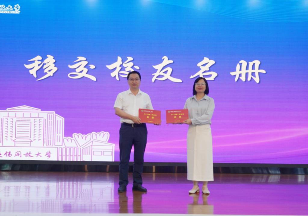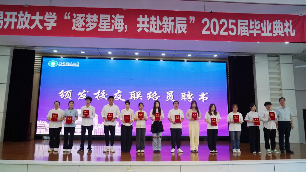 校友是学校事业发展的宝贵资源和强大动力,校友兴,则学校兴。教务处处长张启森向校友联谊会办公室主任徐芬移交校友名册。丁晓华副校长宣读聘任2025届毕业生校友联络员的决定,并为14名校友联络员颁发聘书。