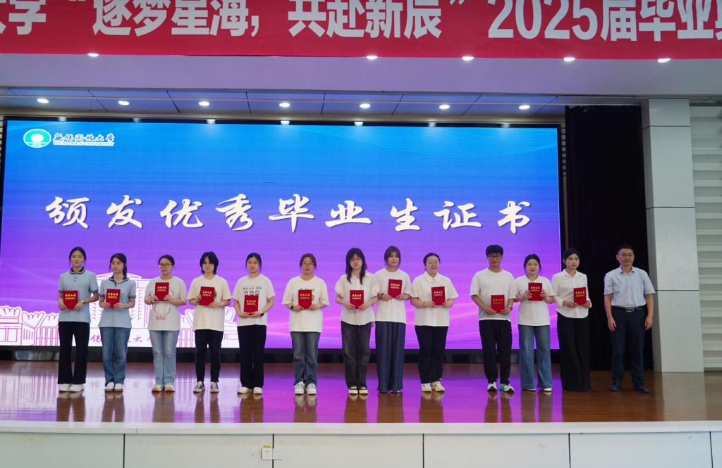 在学校党委、行政的正确领导下,在全体老师的辛勤培育下,2025届毕业学子们曾在教室“悬梁刺股”,在实训室“爆肝修炼”,在赛场“开挂夺金”,在各个领域发光发热,为学校的高质量发展贡献青春力量,他们用实力证明:职业教育没有“天花板”!杨磊云副校长代表学校宣读表彰2025届优秀毕业生的决定,并与关工委奚小网副主任分别为优秀毕业生颁发荣誉证书。