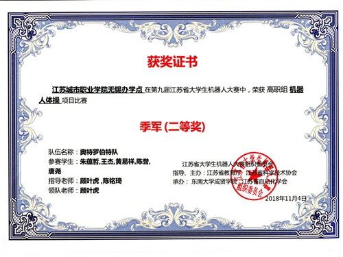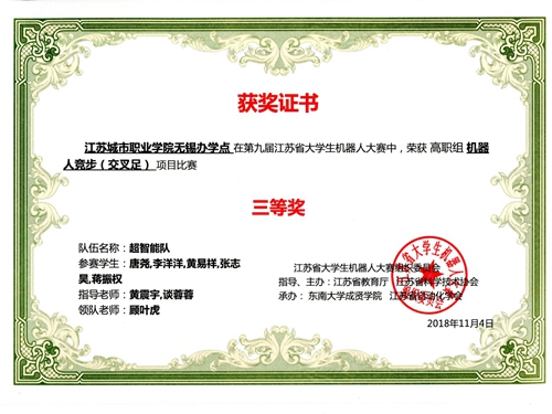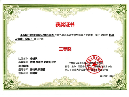 2018年11月3日江苏省第九届大学生机器人大赛在南京东南大学成贤学院举行。我校机电工程系自动化社团8名学生组成的参赛团队,发挥出色,再创佳绩,荣获二等奖一项(高职组季军),三等奖两项。本次比赛参赛规模和比赛项目类别为历届之最,来自南京大学、东南大学、解放军陆军工程大学等近百所高校、超过700多支队伍、2千多名师生参加了比赛。我校选手参加了机器人竞步(窄足、交叉足),机器人体操3个项目的竞赛角逐。