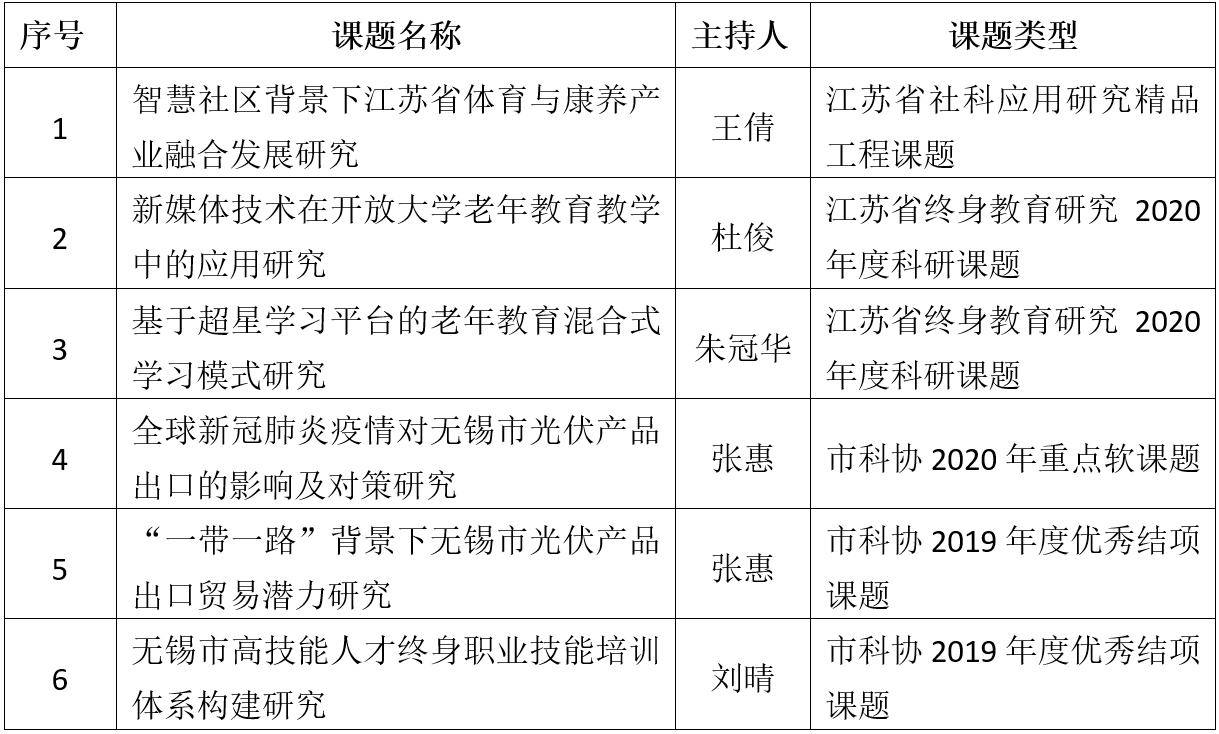 近日,从江苏省社科联、江苏省终身教育研究会、无锡市科协等单位传来喜讯,我校申报的多项课题获准立项。其中,江苏省社科应用研究精品工程课题1项,江苏省终身教育研究科研课题2项,无锡市科协2020年度重点软课题1项,无锡市科协2019年度优秀结项课题2项。